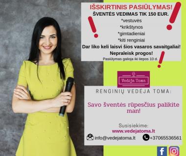 Džiaugiuosi, kad užsukote čia. Susipažinkime – esu renginių vedėja mylinti savo darbą, kuri kruopščiai ir atsakingai pasiruošia kiekvienai šventei individualiai. Man, kaip renginio vedėjai, svarbu, kad renginys/šventė būtų kruopščiai apgalvota ir tinkama mano užsakovams, todėl išklausiusi Jūsų norus, paruošiu šventės planą, kurį patvirtinsime kartu. Švenčių metu neverčiu svečių daryti tai, ko jie nenori, neskatinu kilnoti taurelių, linguoti susikabinus už parankių prie stalo ar atlikti užduotis, dėl kurių svečiai gali pasijusti nepatogiai.